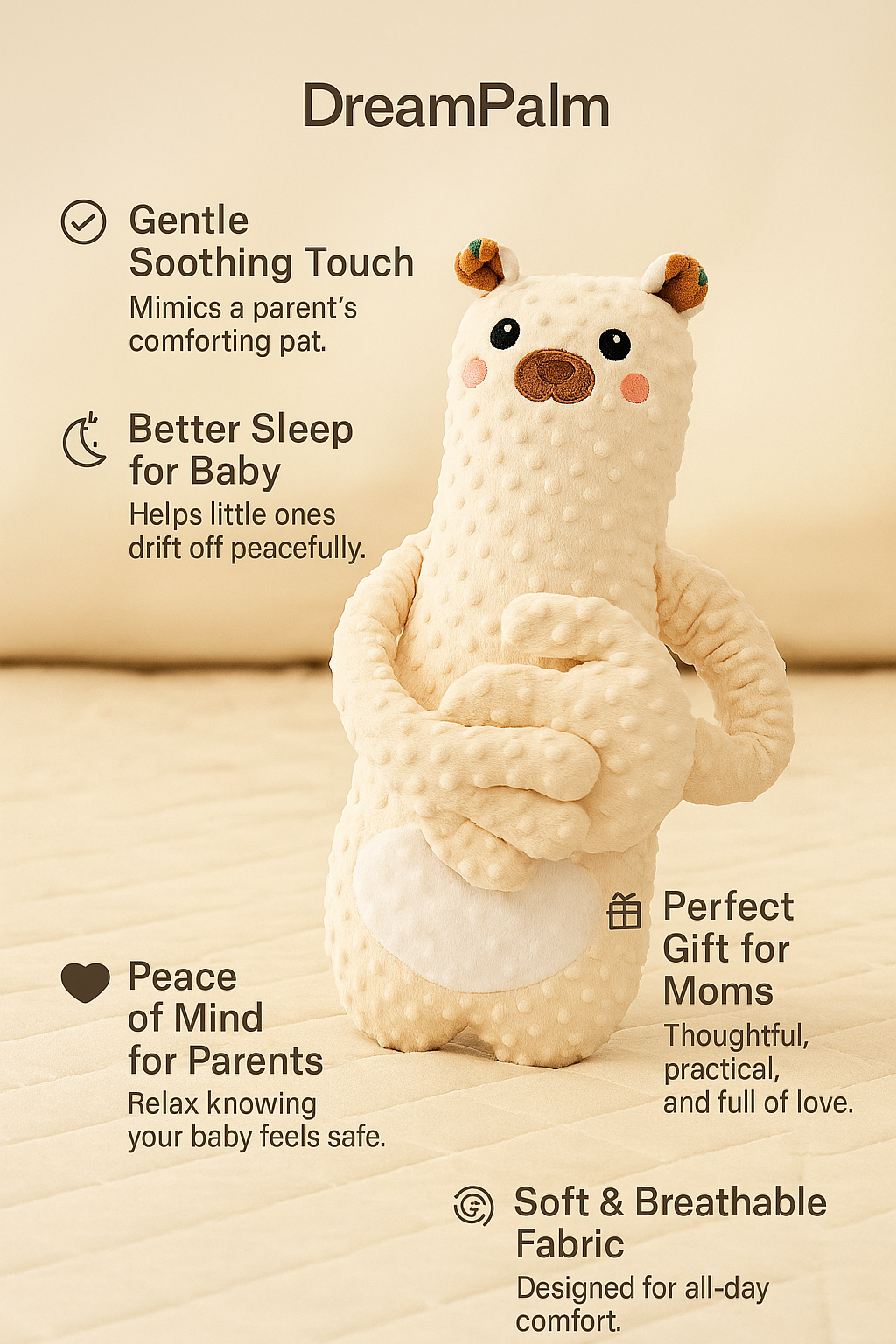 That’s where DREAM PALM™ comes in — the soothing hand every baby (and mom) deserves. Specially designed for newborns to 3-year-olds, DREAM PALM™ gently pats your baby with a soft, rhythmic motion that mimics a mother’s loving touch. Its plush, breathable fabric wraps your baby in cloud-like comfort, while the adorable animal design makes it their cuddly best friend.